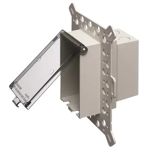 Arlington's low profile in box for new construction stucco, textured surfaces and rigid siding. It is a one-piece recessed electrical box with waterproof-in-use extra-duty cover for stucco over masonry or wood construction. Can also be used for cementitious/fiber rigid lap siding.