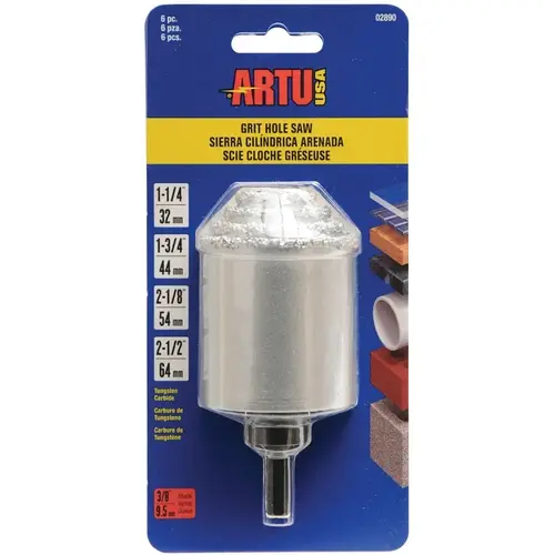 Tungsten carbide grit set includes 1-1/4, 1-3/4, 2-1/8, 2-1/2 in, arbor and pilot bit. Cuts ceramic tile, concrete block, cement board, brick, fiberglass, plexiglass, PVC, wood with nails, cultured marble and drywall.
