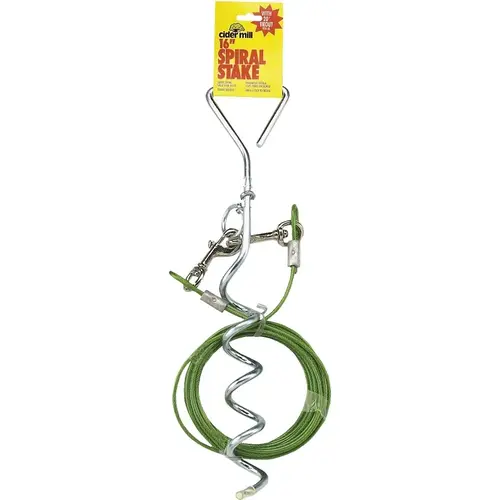 16 in super-strong solid steel shaft designed to stay firmly anchored in the ground. Attached, a 20 ft galvanized steel aircraft cable coated with crack-resistant, UV protected vinyl for smooth quiet running. This is the ideal selling item in the dog tie-out category.