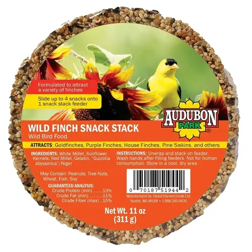 Audubon Park Wild Bird Food, Snack Stack, 11 oz Net Content, Attracts: Goldfinches, House Finches, Pine Siskins, Purple Finches, Ingredients: White Millet, Sunflower Kernels, Red Millet, Gelatin and Nyjer Seed, Nutritional Information: 13% Crude Protein (min), 11% Crude Fat (min), 15% Crude Fiber (max)
