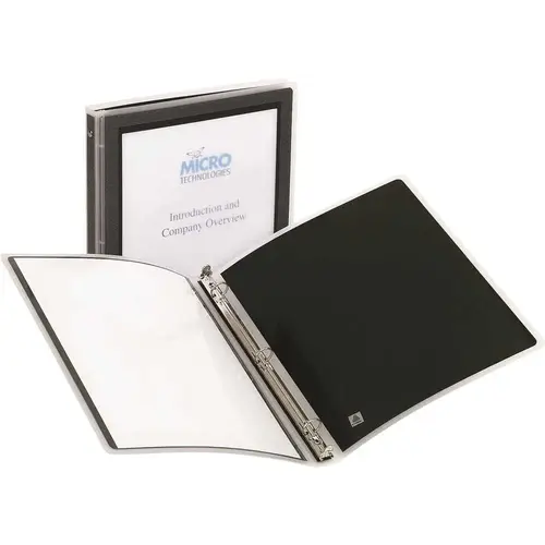 Flexible presentation binder with round rings features a stylish graphic border on the cover that helps your work look professional and neat. Clear overlay allows customization both outside and inside. Lightweight design allows easy carrying. Nonstick poly material prevents ink and toner transfer. 3 metal round rings are mounted on the spine to hold 1/2 in. stack of paper. 1/2 in. ring capacity accommodates approximately 100 letter-size sheets. Binder also features exposed rivets.
