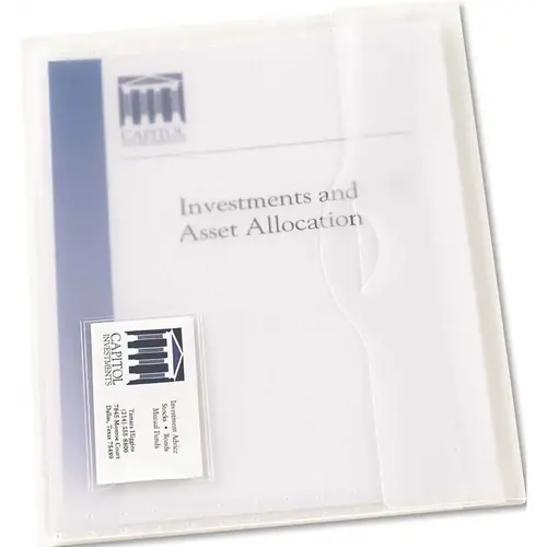 Matte finish translucent polypropylene wallet encases and protects paperwork during transport and a sturdy die-cut flap closure ensures the wallet remains sealed. Business card holder on front completes the professional impression. Holds up to 50 sheets of paper. File Jackets/ Sleeves/Wallets Type: Wallet; Material(s): Polypropylene; Height: N/A; Width: N/A.