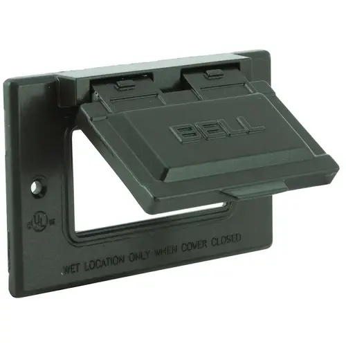 For outdoor horizontal use. Powder coat finish. Scratch-resistant. Self-closing lid assures protection when receptacle is not in use. Includes installation hardware, gasket and multi-lingual instructions. UL 514-A listed, File E 195978 C/UL CSA C22.2 No. 18 NEMA 3R rated.