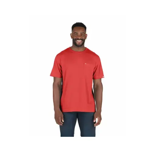Medium Red Short Sleeve Light Weight T-Shirt. Moisture-wicking technology dries sweat quickly. Stain release keeps this T-Shirt looking new. Athletic fit for a modern look with room to move. Taped neck seam and tagleShort Sleeve neck label prevent chafing. Chest pocket easily stores small items.