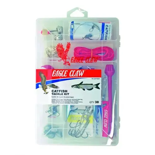 Eagle Claw Tk-Catfish, 38 Piece, Catfish Fishing Kit With Utility Box, Includes Poly Stringer, Hook Remover & Deluxe Skinning Pliers, Bells, Swivels, Hooks, Sinkers & A Bobber.