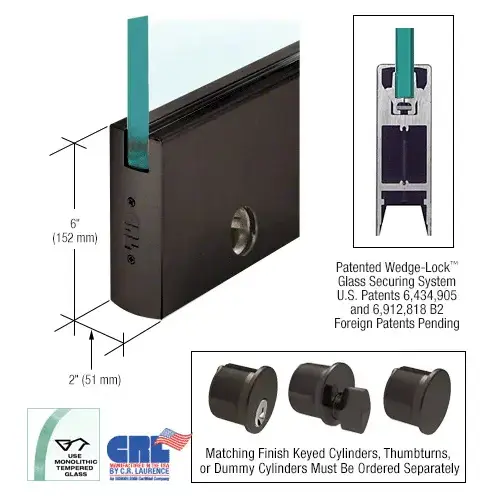 Other reasons to choose CRL Wedge-Lock Door Rail System: Models are available to accept 3/8" or 1/2" (10 or 12 mm) glass; a rigid single component housing that will not shift and fall out of adjustment over time because it is not made up of two halves; the internal components do not require removal before installation; the glass securing pads are designed for longevity in extreme environments.