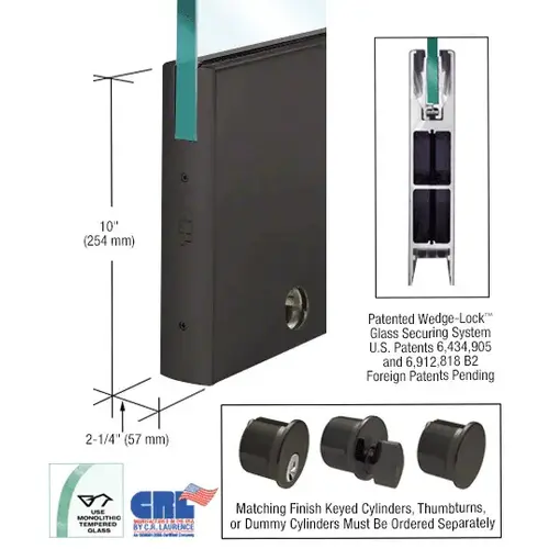 CRL Wedge-Lock Door Rails come in several standard finishes, and can be quoted in custom finishes and widths upon request. Rail Specifications, Templates and Hardware Packages are available from DK Hardware Sales