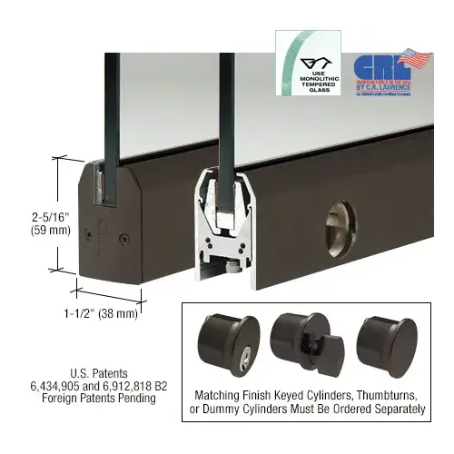 Our CRL Low Profile Door Rail measures only 2-5/16" (59 mm) tall by 1-1/2" (38 mm) wide, and yet it incorporates our patented Wedge-Lock Glass Securing System (U.S. Patents 6,434,905 and 6,912,818 B2, Canadian Patent 2,419,706, and European Patent No. EP 1 404 939 B1) CRL Low Profile Door Rails come complete with End Caps and are ready-to-install. They also come with installation instructions and adjustment wrenches.