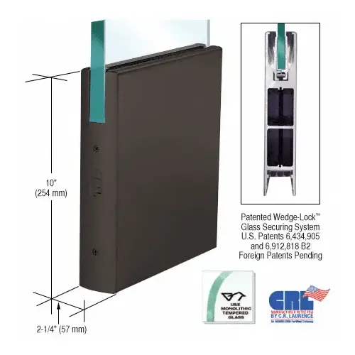Our innovative glass entrance system, the CRL Wedge-Lock Door Rail System features the exclusive CRL Wedge-Lock Securing System (U.S. Patents 6,434,905 and 6,912,818 B2, Canadian Patent 2,419,706, and European Patent No. EP 1 404 939 B1). A concept for securing the glass in the door rail. It works by applying pressure from the bottom of the door rail, using two glass retaining aluminum extrusions via a flat stainless steel bar. As this bar is pulled down with socket head cap bolts, pressure is applied to the glass retaining aluminum extrusions. The bottom of the extrusions are at an angle and fit into an angled groove in the door rail. As the glass retaining extrusions are being pulled down, the angled wedge in the door rail also pulls the glass retaining extrusions together. This action, along with our specially designed door retaining gasket, creates a tremendous amount of force (more than 900 lbs.) in our 9" (228.6 mm) Corner Rail. That's 100 lbs. per inch. Imagine how much force is created in our full length 35-3/4" (908 mm) Door Rails!