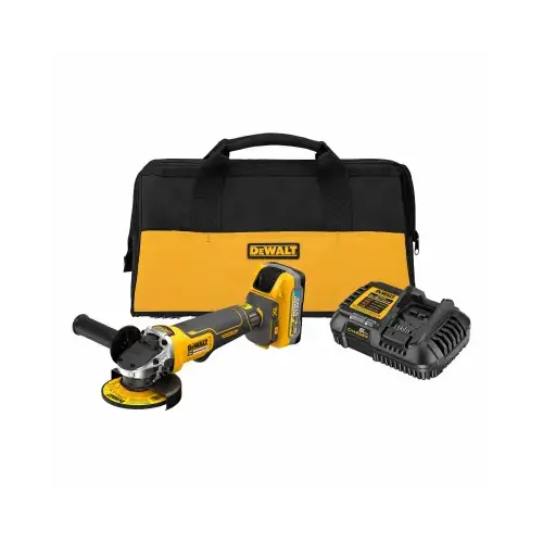 20V 4-1/2" brushless small angle grinder requires no time changing brushes, and offers a longer motor life. It offers a high level of protection. Its break stops the wheel in 2 seconds or less. The Kickback Break engages maximum force to stop the wheel when there is a pinch, stall, or bind-up to reduce kickback. The grinder will also shut off in those events to further protect the user. This kit includes our most powerful battery in its class**, the 20V MAX* DEWALT POWERSTACK 5.0 Ah battery. The DEWALT DCBP520 is compatible with all 20V MAX* tools and chargers.
