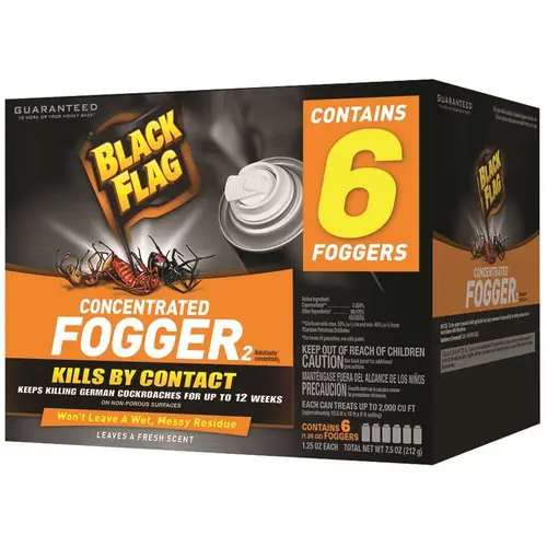 Insects invading your corner of the world. Whatever insect you're fighting, Black Flag products are dedicated to providing the tools you need to regain control. Black Flag products don't mess around. Our indoor/outdoor pest arsenal has been arming homeowners in the battles against invading bugs for more years than any other brand. With quick, decisive formulas that act fast and never back down, Black Flag insect control gets the job done and take no prisoners. The Black Flag Concentrated Fogger is a dual action fogger, because it penetrates cracks and crevices to kill bugs where they live and breed and leaves a fresh scent. It kills the following insects by contact: spider (except brown recluse), ants (except fire, carpenter, harvester and Pharaoh ants), roaches, fleas, house flies, mosquitoes, brown dog ticks, silverfish and firebrats. It is perfect to use in apartments, attics, basements, garages and household storage areas. It continues killing German cockroaches for up to 12-weeks on non-porous surfaces. Each can treats up to 2,000 cu. ft. (approximately 15.5 ft. x 16 ft. x 8 ft. ceilings).
