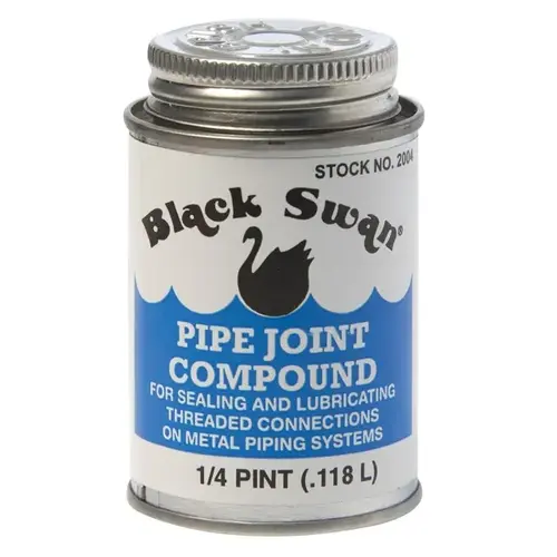 Black Swan's Pipe Joint Compound is a smooth, grit-free, gray colored pipe joint compound. It seals threaded joints tight and will not crack or crumble. Disassembly months or years later is easy. Contains no lead and is safe for all water systems. Black Swan's Pipe Joint Compound is recommended for use on all types of metal connections. Not recommended for use on plastic. Black Swan Pipe Joint Compound can be used on lines carrying air, water, steam, natural gas, ammonia, brine, dilute acids and alkalies. Not recommended for lines carrying oxygen.
