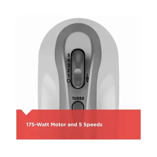 Professional wire beaters. Lightweight and ergonomic design. Bowl and heel rest. Less mess for slow first speed. 175 W of power and five speeds. Easy to clean. Dishwasher-safe parts. By pushing the power boost button you can increase the mixing power then release it to continue at normal speed. Convenience is at your fingertips with the heel and bowl rests as they make it easy to set the mixer down and prevent dripping between tasks.