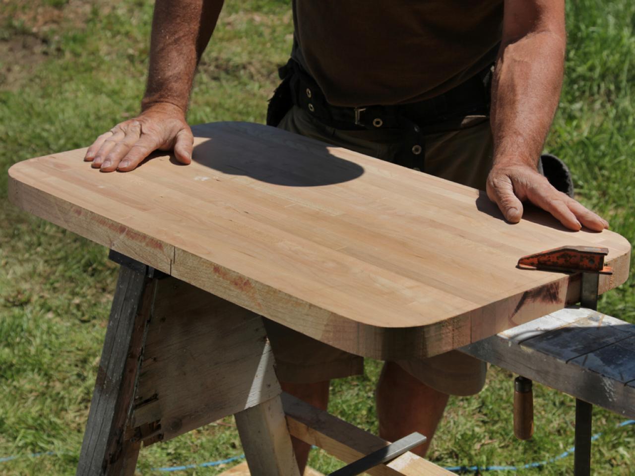 Once you have your butcher-block material, smooth the perimeter with an orbital sander to remove only blade marks and high spots. Be careful not to reshape the piece.