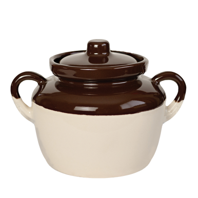 Decorative bean pot for baking, heating, serving, and storing. Bristol pot with side handles and brown lid. Lead free, nonabsorbent, and stick resistant. Conventional oven, microwave, and dishwasher safe. 11 In. W. x 8 In. H. x 9 In. D. 5.5 Lb.