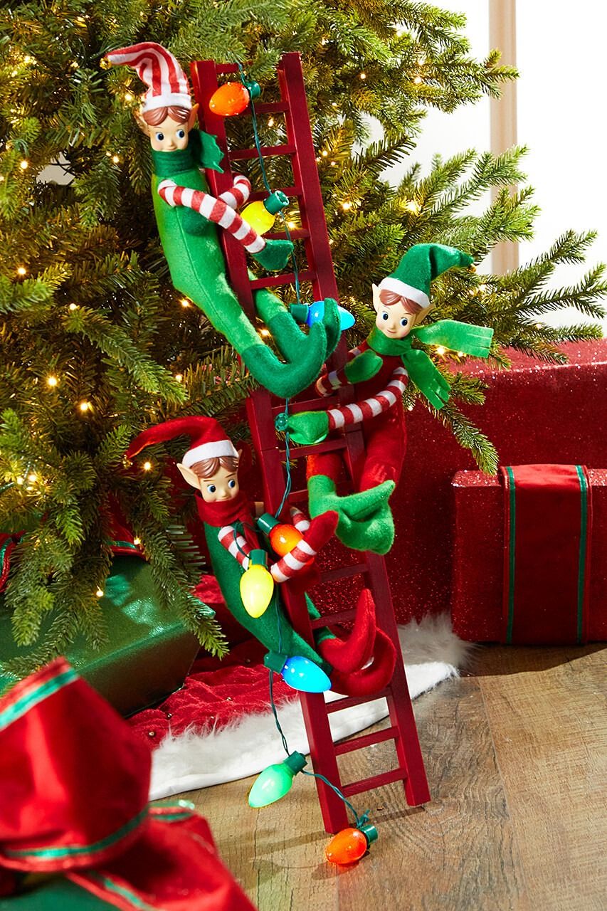 Tree Trimmers, Three vintage elves on a ladder with an LED light string. Decorate tree side or tabletop. Battery operated with 6-hour timer. Santa's Elves made their way to your home in their Illuminated elf ladder called Tree Trimmers by Mr. Christmas.