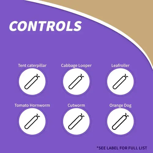 Controls caterpillars, loopers, cabbageworms, hornworms, leaf folders and leaf rollers. One pint treats up to 10,875 sq-ft. Won't harm beneficial insects. Contains BT Kurstaki, a liquid formulation of bacteria.