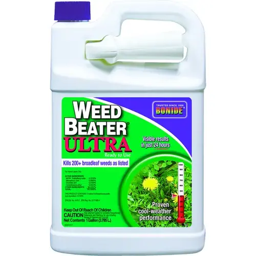 New chemistry that's especially effective on over 200 hard to kill weeds, right to the roots. Visible results in just 24 hrs. Rain fast once dry. Reseed in just 2 weeks. Great cool weather performance down to 45 deg F extends application window to early spring and to late fall when weeds are most susceptible. Non 2,4-D formula contains MCPA, Mecoprop-p, Dicamba and carfentrazone.