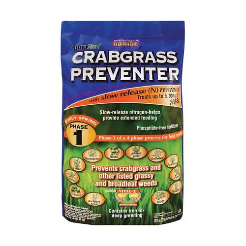 BONIDE Duraturf crabgrass and weed preventer is a pre-emergent that controls grassy and broadleaf weeds. One application can last between 2 to 4 months. Stops crabgrass, clover, chickweed, oxalis, spurge and over 200 more listed weeds.
