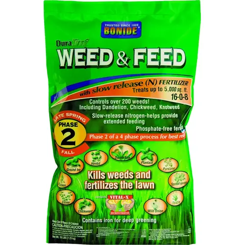 BONIDE DuraTurf weed and feed is a slow-release nitrogen-based fertilizer and weed killer It kills dandelions and other listed broadleaf weeds on contact. Fertilizer is phosphate-free.