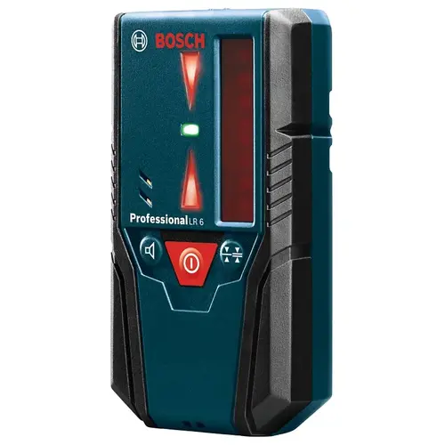 The Bosch LR 6 line laser receiver allows users of the GCL 2-160 self-leveling cross-line laser to receive the line further, with precision. The LR 6 makes line laser detection possible at distances up to 165 ft and it extends its operation outdoors, in bright-light conditions or catches beams midair when there is no surface to see the beam on. The receiver's dual-sided LED arrow indicators make the receiver more flexible and it has a volume-adjustable audio signal that give clear on-grade position indication and an accuracy button for fine or coarse adjustment. For mounting options, the receiver has built-in heavy-duty magnets that securely attach to metal surfaces, allowing easy setup on suspended-ceiling installations. The LR 6 includes a click-in mounting bracket, for simple and secure assembly, especially to a leveling rod.