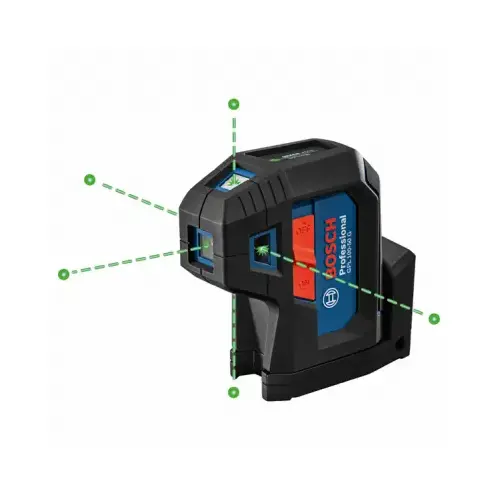 The Bosch GPL100-50G features a five-point, self-leveling laser with +/-1/8 in accuracy at 30 ft for up or down plumb, align and level applications (the bottom point's accuracy is +/-1/4 in at 30 ft). This unit features green-beam technology, which is up to 4X brighter than standard red beams. It also has the Bosch exclusive VisiMax technology, which delivers maximum beam brightness in most jobsite conditions. The unit includes point projection to the front, so it can be used in a variety of positions for flexibility on the job. It is faster than a standard manual plumb bob. The unit includes several durability features, such as the smart pendulum system to lock the laser when switched off, 360 deg rotation, a hard carrying case and full rubber overmold housing. The integrated multi-purpose laser mount features strong magnets and allows the user to mount the laser virtually anywhere.