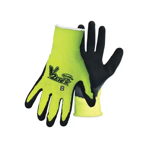 Textured latex coated pal, provides exceptional grip and protection from cuts and abrasions, a fluorescent polyester shell offers good visibility, breathability and movement; knit wrist seals out dirt. Fluorescent, black color.