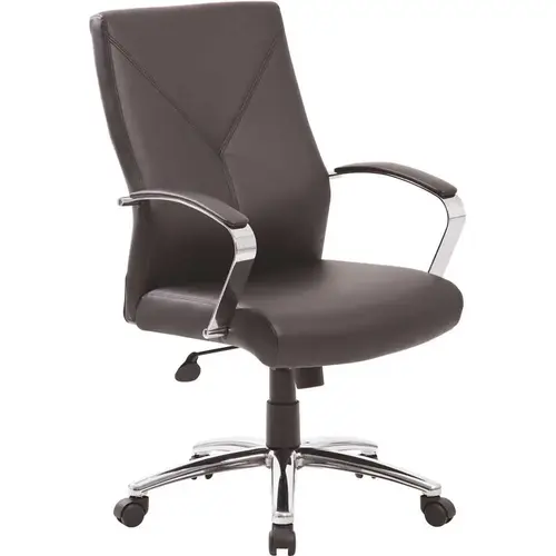 Contemporary Styled Chair. Upholstered in Black LeatherPlus. Metal chrome plated padded arms.