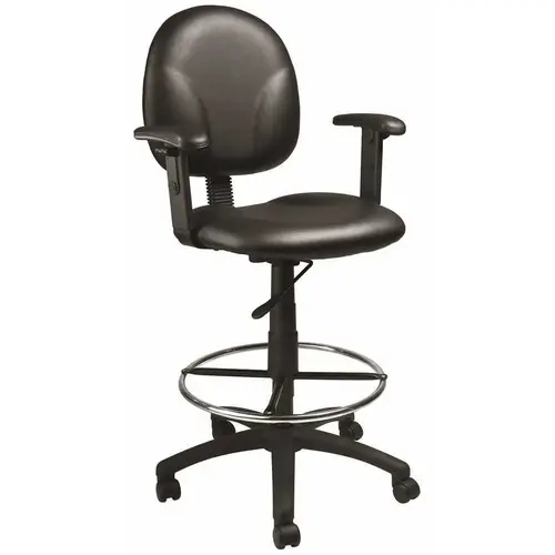 All-purpose Commercial Grade Drafting Stool. Adjustable Arms. Gas-lift seat height adjustment. Euro-style nylon base with heavy duty dual wheel casters. Available in 4-fabric colors and Black Vinyl.