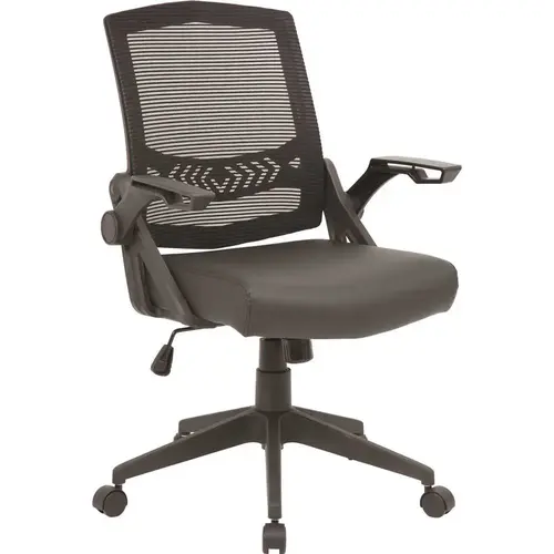 Breathable mesh back. Upholstered seat cushion. Flip arms. Spring tilt mechanism. Upright locking position. Pneumatic gas lift seat height adjustment. 25 in. black nylon base. Hooded double wheel casters.