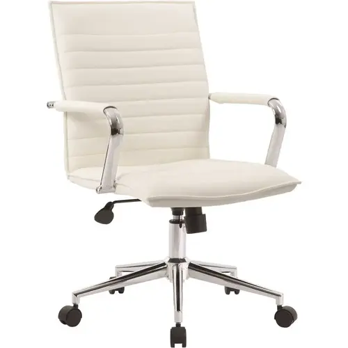 This hospitality task chair in white vinyl is designed with fixed chrome arms for that pop of metallic color that brings any room or office to the next level. The chair also features a gorgeous and strong chrome 25 in. base with 2 in. nylon dual wheel castors. In addition to looking fantastic, the chair also features a spring tilt mechanism, a pneumatic gas lift for easy height adjustability, tilt tension and an upright lock, while also boasting a weight capacity of 275 lbs.