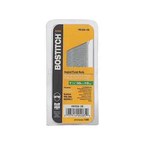 Bostitch Finish Nail, Collation Type: Glue, Collation Angle: 25 deg, Head Type: Flat, Point Type: Chisel, Shank Type: Smooth, Material Gauge: 15 ga, 1-1/2 in L, Steel, Bright, Suitable for: N59FN, N60FN, N62FN, N62FNK-2, BTFP72156 Nailers