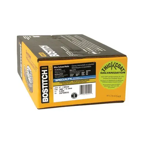 Bostitch Siding Nail, Collation Type: Wire Weld, Collation Angle: 15 deg, Point Type: Blunt Diamond, Shank Type: Smooth, 0.092 in Dia, 2 in L, Steel, Thickcoat, Suitable for: N63CP, N64C,N66C, N66B Pneumatic Nailer, Hitachi NV65AH, Max CN565, Makita AN611, Porter-Cable COIL200, COIL250 Tools