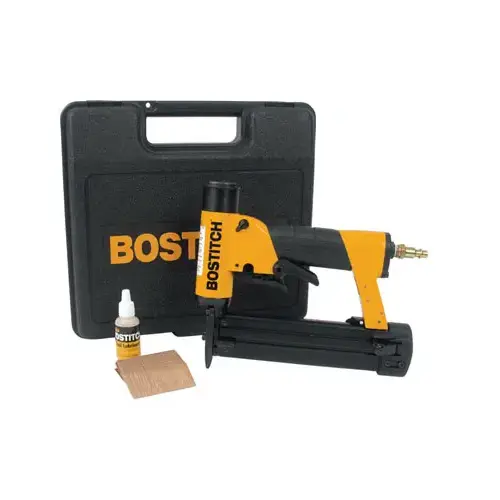 Adjustable high/low power control sets pin depth without changing compressor setting. Low-profile nosepiece tapers down to contact point. Lightweight, durable aluminum housing. Overmolded grip. Rear exhaust. Weighs 2.5 lb, driving power is 60 in-lb, operating pressure is 70 to 120 psi, 1/4 in NPT thread fitting type, magazine capacity is 200 pins. 1/2 to 1-3/16 in 23 ga headless pin nails. Includes pin nailer, 1/4 in air fitting, 500 each of 1/2 in pins, 3/4 in pins, 1 in pins and case.