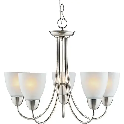 Boston Harbor Chandelier, Medium Base Lamp Base, 60 W Lamp, 5 Lamps, Clear Light, Ceiling Mounting, Frosted Glass Shade, 18-7/8 in Overall Height, 22-1/2 in Overall Width, Brushed Nickel, cULus Listed. Boston Harbor 5 Light Brushed Nickel Chandelier. What better way to make a room beautiful than with this 5 light chandelier. The chandelier has a beautiful frosted glass shade and a brushed nickel finish. Measures 22-1 /2 in width x18-7 /8 in height and uses 60 watt maximum clear medium base bulbs (sold separately).