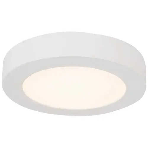 LED flush mount ceiling fixture has a white finish, acrylic shade, 550 lumens, 3000K warm white, 120V 10W. Size: 5-1/2" W x 1" H, dimmable. LEDs included; no bulbs to replace. 5-year Limited Warranty, ETL Listed / Energy stars.