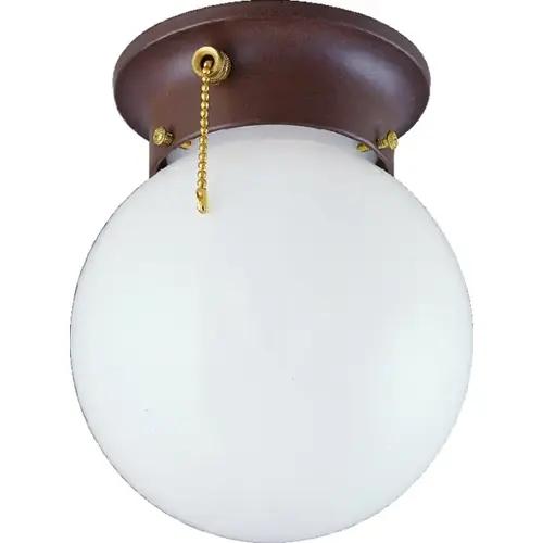 Single light ceiling fixture has a pull chain, sienna finish and opal glass shade. Measures 5-7/8 in Dia x 7-1/8 in H. Uses 1x 60W maximum type A19 medium base bulb or 1 x 13W CFL bulb (not included). ETL Listed.