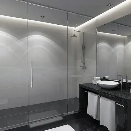 Our stock 28"W x 84"H (711 mm x 2.13 m) Transpara Shower Door Kit arrives ready-to-install with the Low Profile Door Rails factory bonded to the 3/8" (10 mm) thick tempered glass. No additional cut-outs or notches are required because the door is already prepped with two 1/2" (12 mm) diameter holes, and includes our BM6X6 Back-to-Back Pull Handle. Other than the Handle, there is no visible hardware between the bottom and top of the door. Transpara allows 1" (25 mm) total door closing position adjustment. A water management system in the bottom pivot, along with our SDTW Vinyl Wipe integrated into the Door Rail, assist in minimizing water leakage. Transpara is compatible for Soffit or Header mounting. Tempered glass for fixed panels is ordered separately, or customer supplied. Available in four stock finishes.