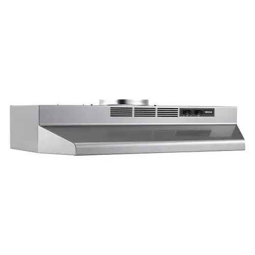 Broan 24 In. Convertible Under-Cabinet Range Hood, 230 Max Blower CFM, Stainless Printguard Technology Introduces A Fingerprint Resistant Stainless Finish Range Hood That Seamlessly Matches With Other Stainless-Steel Appliances In The Kitchen Stainless Finish is easy to wipe clean from daily messes both externally and underneath, forget the elbow grease The scratch resistant finish deters wear and tear on the hood Proudly manufactured in the USA by the Leaders in Indoor Air Quality with foreign and domestic components Flexible installation in a variety of applications with both vertical and horizontal exhaust options via 4-way convertibility; a 3-1/4 in. x 10 in. damper/duct connector and 7 in. round duct adapter plate included (7 in. damper sold separately) This HVI Certified range hood provides sufficient ventilaiton at 230 Max Blower CFM to remove smoke and cooking odor from the air Rocker switches allow you to manage the 2 speed fan and 1-level lighting separately (up to 75W, bulb sold separately) Removable, reusable, dishwasher-safe aluminum mesh filter for easy cleaning and maintenance; supports ductless filtration via non-ducted filter (sold separately) Enclosed light and fan/filter assemblies, mitered corners and hemmed edges for good looks and easy cleaning One year limited warranty UL listed and HVI 2100 certified Mfg #F4024SF