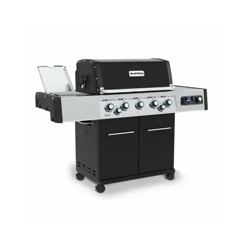The Broil King Regal Q 590 Pro IR with iQue technology takes the guesswork out of grilling. Master smoking, roasting, rotisserie, and grilling with ease. The Regal Q 590 features 995 sq. in. of total cooking space (625 sq. in. primary grilling area). Powered by five Dual-Tube burners producing 55,000 BTU, the Regal Q 590 Pro IR ensures exceptionally even heat. The full coverage stainless steel Flav-R-Wave system vaporizes food juices that create rich barbecue flavour. The 10,000 BTU infrared side burner sears at 1700 degreeF, and the 15,000 BTU rear burner and premium rotisserie kit expand grilling options. The solid stainless steel cooking grids provide superior heat retention and searing power. The category leading premium and performance features combine style, functionality, and durability. Backed by a Limited Lifetime warranty on the cookbox and a 15-year warranty on remaining parts and paint (3 years on iQue components), this grill is built to impress and built to last.