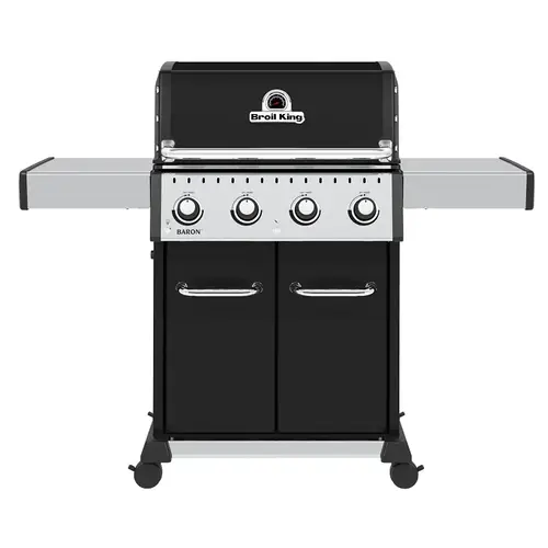 Broil King Baron 420 PRO Gas Grill, Liquid Propane Gas, 460 sq-in Primary Cooking Surface Area, 200 sq-in Secondary Cooking Surface Area, 40,000 Btu/hr, 5 Burners, Stainless Steel Grate, Electronic Ignition, Valve Control, Thermometer Included: Yes, Side Shelf Included: Yes, Aluminum/Stainless Steel Body, Porcelain Enameled Cast Aluminum/Stainless Steel Frame, Black, Dimensions: 45-1/2 in H x 57 in W x 24 in D