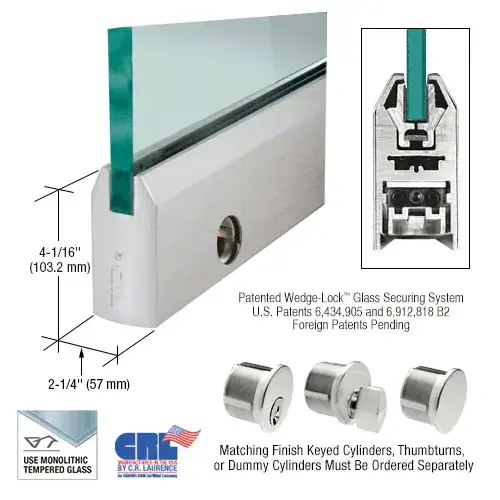 Our innovative glass entrance system, the CRL Wedge-Lock Door Rail System features the exclusive CRL Wedge-Lock Securing System (U.S. Patents 6,434,905 and 6,912,818 B2, Canadian Patent 2,419,706, and European Patent No. EP 1 404 939 B1). A totally new concept for securing the glass in the door rail. It works by applying pressure from the bottom of the door rail, using two glass retaining aluminum extrusions via a flat stainless steel bar. As this bar is pulled down with socket head cap bolts, pressure is applied to the glass retaining aluminum extrusions. The bottom of the extrusions are at an angle and fit into an angled groove in the door rail. As the glass retaining extrusions are being pulled down, the angled wedge in the door rail also pulls the glass retaining extrusions together. This action, along with our specially designed door retaining gasket, creates a tremendous amount of force (more than 900 lbs.) in our 9" (228.6 mm) Corner Rail. That's 100 lbs. per inch. Imagine how much force is created in our full length 35-3/4" (908 mm) Door Rails!