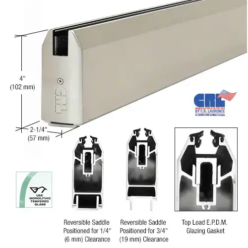 The CRL 4" (102 mm) Tapered Sidelite Rail is commonly used in office and storefront applications to secure fixed glass panels. Since the profile matches our Door Rails, these Sidelite Rails can be used top and bottom for a matching look, or with a variety of smaller configuration U-Channels. Glass is installed easily with the 'lift and drop' method using our 4" (102 mm) Aluminum and Neoprene Setting Blocks. Glass is secured with a Top Load EPDM Roll-in Glazing Gasket that eliminates the messy application of silicone sealant. Also available in this size are our 4" (102 mm) Square Sidelite Rails to match our Square Door Rails.