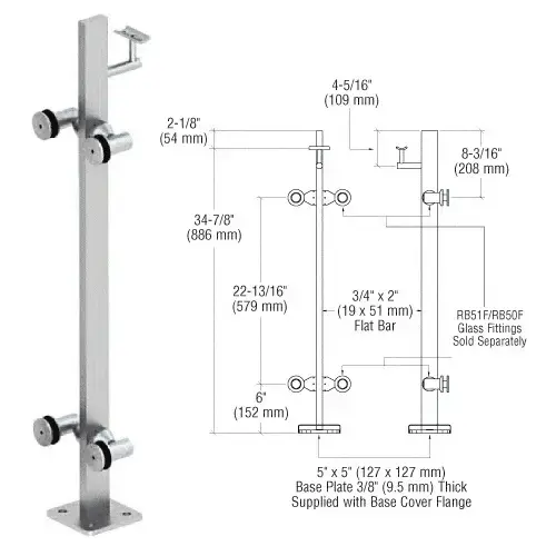 CRL P3 Surface Mounted Post Railing Kits are designed for commercial or residential installations that meet or exceed guard rail and hand rail code standards. The P3 Post Railing Kits are manufactured from 3/4" x 2" (19 x 51 mm) stainless steel flat bar. Kits are supplied complete with a 5" x 5" (127 x 127 mm) Base Plate and Base Plate Cover. Hand Rail Brackets and Fixed or Swivel Glass Mount Fittings are sold separately.