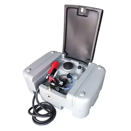 Move and store fuel at the job site, on the farm, or when traveling in remote areas. The Black Bull Low Profile Diesel Fuel Transfer Tanks and Pump holds up to 56 gallons of diesel fuel for easy transport and fits under most truck covers. The tough and durable polyethylene tank wont rust and corrode like metal, and can take the rough treatment of life on the road. Arriving assembled, the Diesel Fuel Tank Pump is ready to use out of the box, just fill it from a standard gas-station Diesel pump to have fuel ready to go where you need it. The large capacity Diesel Transfer Tank fits in the truck bed for easy access when filling and pumping and features ridges and grooves that make strapping the unit down easy and secure. The pump is powered by connecting the 16.4 foot cables to a vehicle or trailer battery with positive and negative alligator clips. A 16.4 foot fuel hose makes it easy to get the fuel out of the tank. Padlock the lid to keep your fuel safe, and the nozzle and battery cables dry. Not for use with unleaded gas or other fluids. Designed for use with diesel fuel only.