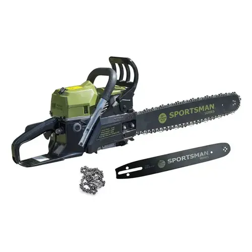 Make quick work of clearing undergrowth, trimming trees, and cutting up firewood with the Sportsman Series 20 inch and 14 inch 52 cc Gas 2-Stroke Rear Handle Chainsaw Combo Kit. Lightweight and balanced, the ergonomic arrangement of the rear and top handle makes it comfortable and maneuverable, reducing vibration, fatigue and the risk of injury. The Sportsman Series 52 cc Gas 2-Stroke Rear Handle Chainsaw comes equipped with both a 14 inch and 20 inch blade and chain, so you can choose the appropriate size for the job at hand. Additional safety features include a built-in safety chain break, which stops the chain in seconds to protect the operator to keep both novice and seasoned users accident free. Anti-vibration mountings on the handle round out the comfort and safety features. The Sportsman Series 20 inch and 14 inch 52 cc Gas 2-Stroke Rear Handle Chainsaw Combo Kit includes a gas powered chainsaw with one 20 inch and one 14 inch blade, one 20 inch and one 14 inch chain, two carbon brushes, a spark plug wrench, a hexagon wrench, a guide bar for chain installation, and a fuel/oil mixing container.