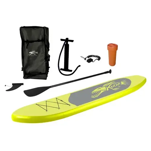 Get out and enjoy the water with the Kuda Inflatable Stand-Up Paddle Board Kit. Made out of ultra durable double layer drop stitch PVC and EVA foam for maximum buoyancy. The inflatable design means this Stand-Up Paddle Board is easy to take anywhere. It deflates and folds up into the included storage bag, so you it can be easily stored in the garage or closet. Packed inside the backpack storage bag is everything needed to use the Inflatable Paddle Board, including a paddle, inflator pump, leash and repair kit. The bright neon color with non-slip deck makes the board easier to see out on the water.