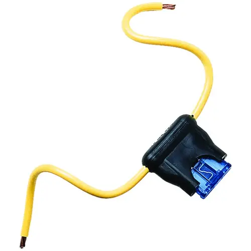In-Line black fuse holder for ATC blade-type fuses from 3 to 30 A, number 12 yellow lead wire. Maximum continuous current rating of 24 A or 80% of the fuse rating, whichever is less.