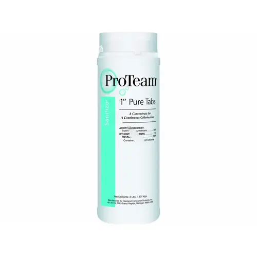 ProTeam C002417-CS20B2 1 Inch Pure Tablets, 2 lb, 12/Case. Stabilized chlorine protected from UV rays. Pressed without gums or binders on high pressure equipment. Provides steady levels of chlorine into pool.