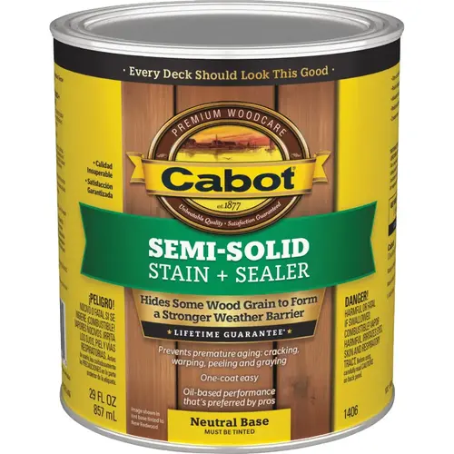 Cabot Semi-Solid deck and siding stains have an alkyd resin base that provides an extremely tough and scuff-resistant finish. Semi-Solid bridges the gap between solid and semi-transparent stains. If a lighter shade is desired, intermix Cabot Semi-Solid clear with other Cabot Semi-Solid deck and siding colors to achieve desired appearance. They are extremely durable stains for use on all types of wood decking, siding, and fencing. Composed of lightly pigmented, deep-penetrating, alkyd resin and refined natural linseed oil. These stains bring out the full beauty of the wood grain and provide deep-penetrating wood protection. They are ideal for use on most types of lumber such as cedar, fir, pine, cypress, spruce, redwood, and weathered pressure-treated wood. These water-repellent stains also resist cracking, peeling, and blistering. For use on decks, siding, fencing, wood patios, wood screening, porches, swimming pool walks, outdoor furniture, steps, and railings. Use on new or previously stained smooth wood surfaces. Dries to a natural, flat finish in approximately 24 to 48 hours, depending on temperature and humidity. Covers approximately 400 to 500 Sq. Ft. per gallon. These rates will vary depending upon the porosity of the surface. Apply 1 even coat with a brush. Do not thin.